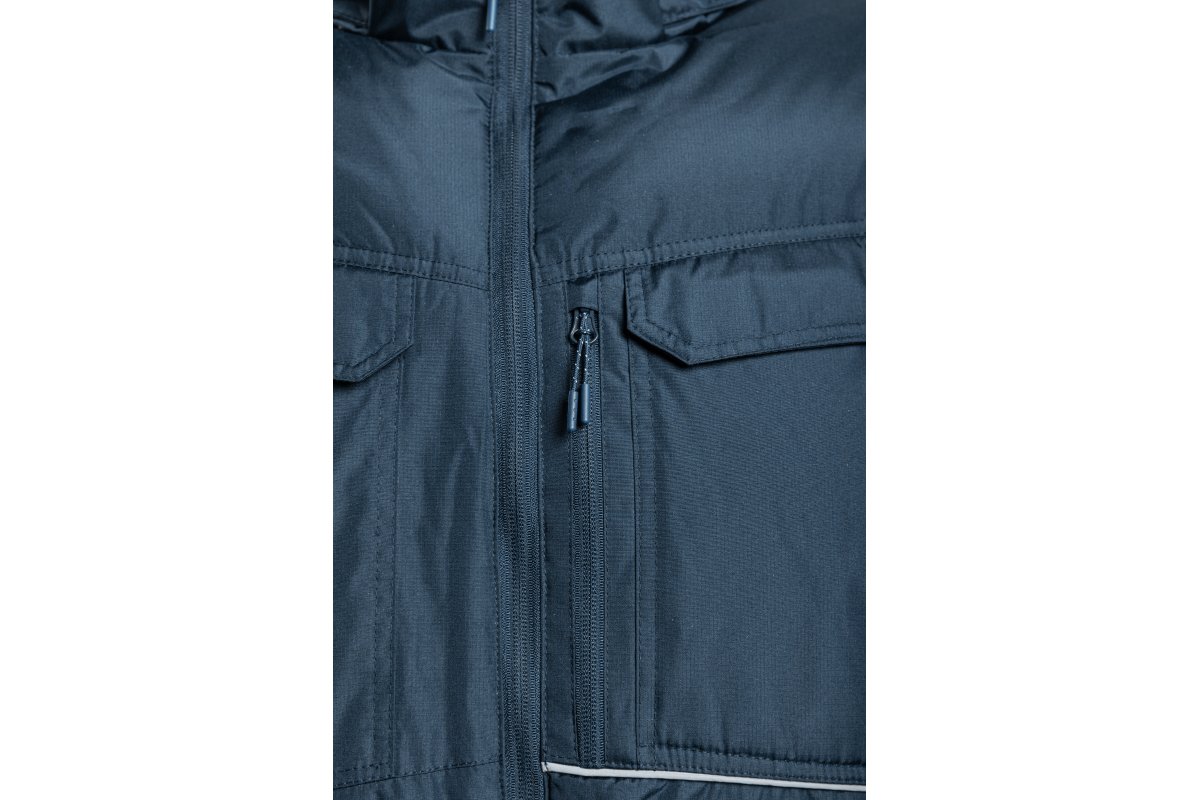 The LEON insulated jacket is a functional model designed for users working mainly outdoors or in cold stores. Made from durable RIP-STOP fabric with a PVC coating, it offers increased tear and weather resistance. Layered insulation and a detachable hood ensure adequate thermal insulation in various zones of the jacket.