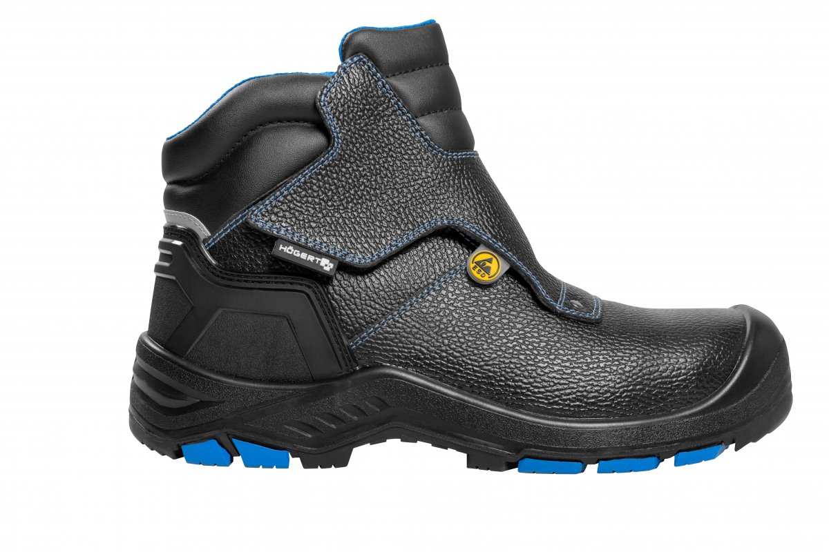 STAD safety boots designed for safety during welding work. Featuring a double Velcro fastening, they offer a quick on and off fit, while the modern Sandwich Mesh lining and KomfortPlus insole ensure comfortable all-day wear. With a split leather upper and reinforced tip, the footwear combines durability with resistance to external factors.